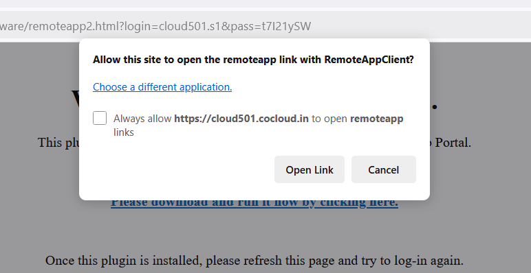 Step 3 : “check the Box” of always allow this Page and click on “open remoteappclient”.